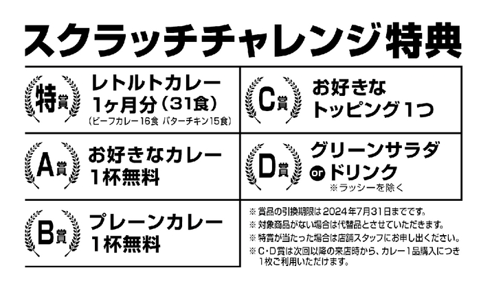 カレー1皿ご注文につきスクラッチカード(はずれなし)を1枚配布いたします。
