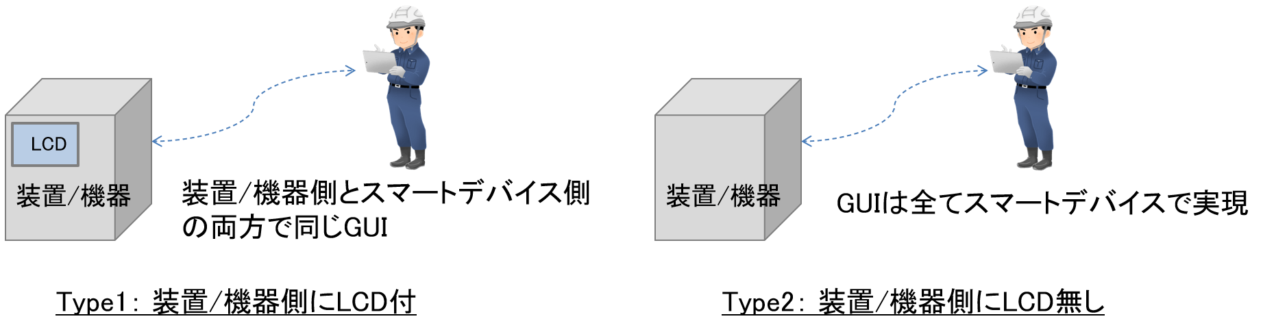 組込機器とスマートデバイスをWi-Fi、Bluetoothなどでつなぎ、組込機器のGUIをスマートデバイス上で表示したり操作したりすることができます。下図Type2の方式(装置や機器をLCDレスにして作業者が必要な時にスマートデバイスを用いてGUI表示や操作を行う)により、対象機器装置や機器のコスト削減を実現することが可能です。