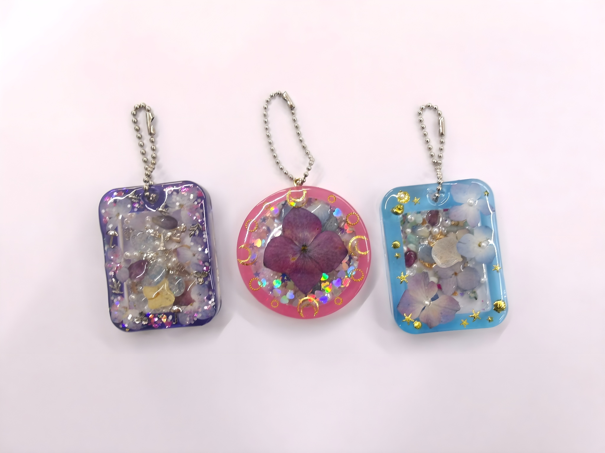 篠崎公園のアジサイ押し花を使って、シェイカーキーホルダー作りを体験いただけます。