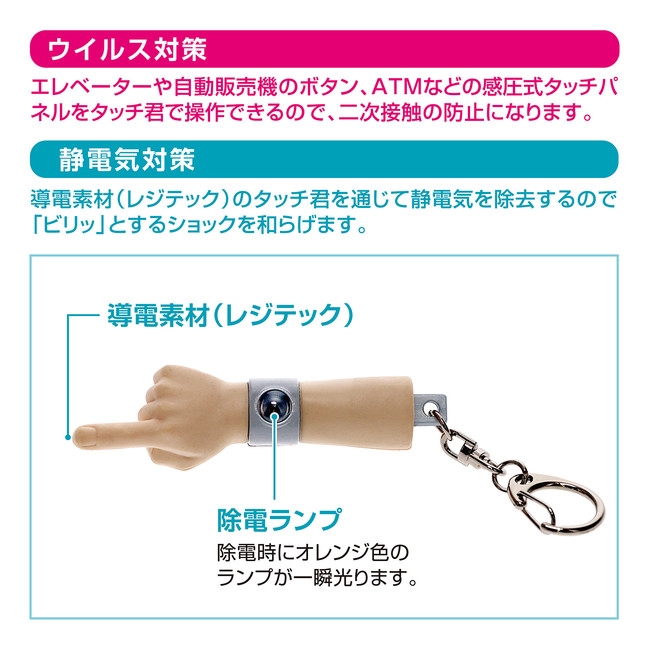 株式会社カーメイト(本社:東京都豊島区)は、静電気除去アイテム『レジテック』シリーズから『みがわりタッチ君3』を11月10日(火)に発売いたしました。従来通り静電気除去の他に、多くの人が接触するエレベーターのボタンやタッチパネルなど、直接触りたくない所を"自分の指の身代わり"にタッチして使用できます。新たにウイルス対策の用途を付加して8年ぶりに復刻いたしました。詳細は以下をご覧ください。
