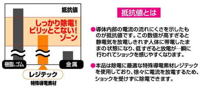 ※『レジテック』は、カーメイトの登録商標(承認登録No:第4133495号)です。『レジテック』は適度な電気抵抗があるため、放電時のビリっとするショックがなくじわじわ除電できる特殊導電素材です。『レジテック』シリーズは現在で200万個以上の販売実績があります。