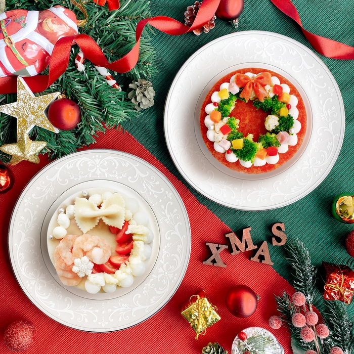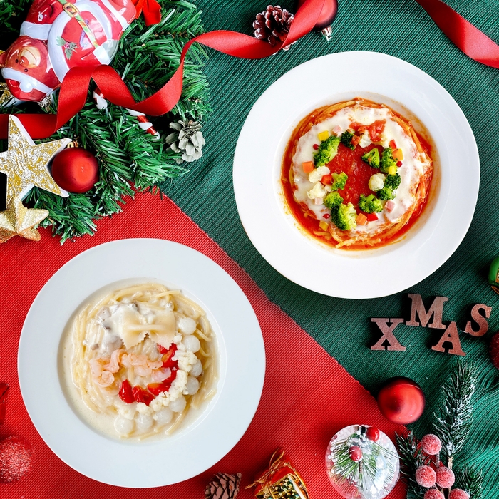 今回新しくラインナップしたのは、リースをモチーフにした、赤と緑のクリスマスカラーが印象的な「ブロッコリースのXmas」と、マカロニのリボンがチャーミングな雪の贈り物をイメージした、濃厚なクリームパスタ「聖なる雪の贈り物」の2種類。