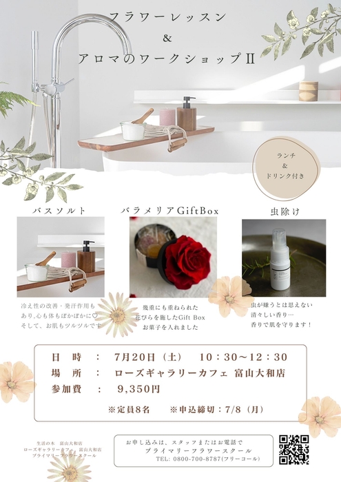 株式会社ジャパン・フラワー・コーポレーション(本社:富山県射水市、代表取締役社長:松村吉章)が運営する「花まつフラワーアカデミー プライマリーフラワースクール」(以下「プライマリースクール」)は「自然」「健康」「楽しさ」のある生活を日本に提案・普及し続けてきたライフスタイルカンパニーの株式会社 生活の木 富山大和店(本社:東京都渋谷区神宮前、代表取締役 重永 忠 以下「生活の木」)とのコラボ企画として7月20日(土)10:30~12:30「心とからだを癒すフラワーレッスン&アロマのワークショップⅡ(ランチ&ドリンク付き)」を開催いたします。