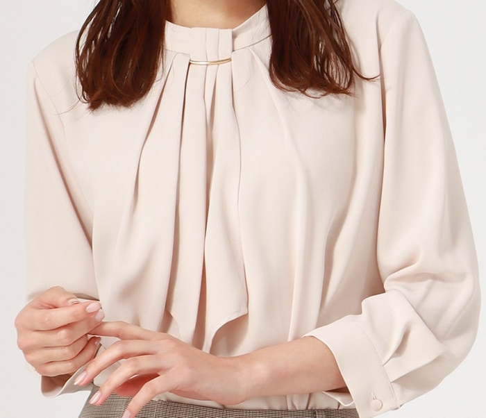 今回のブラウスは、ボウタイのボリュームをやや控えめにすることでビジネスシーンでも使いやすく、ジャケットを着用した際のVゾーンのおさまりを良くしました。袖丈は8分袖に設定し、腕時計が見やすく、ジャケットの袖からブラウスが出ないように調整しています。さらに、背面のボタン開き部分から肌が見えないよう重なりを作り、開きが狭くなる仕様にしています。