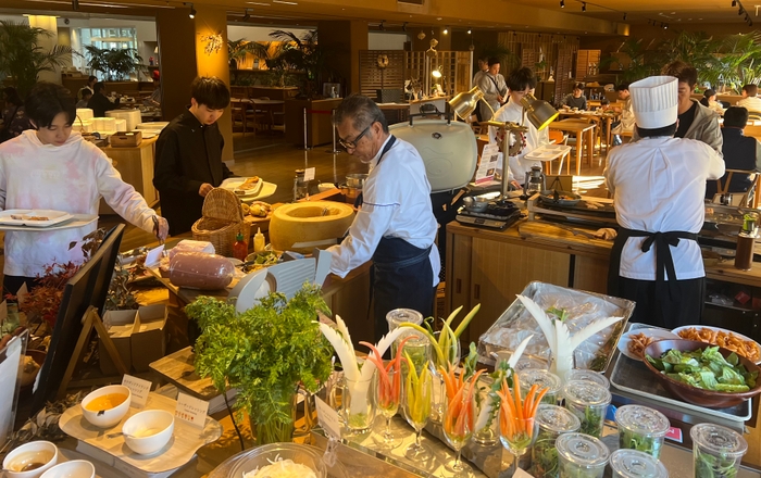 お客様からは「目の前で作られる臨場感が嬉しい」「作りたての温かさが心地よい」といった感想が会場に広がり、朝食を通じた交流の場にもなっています。