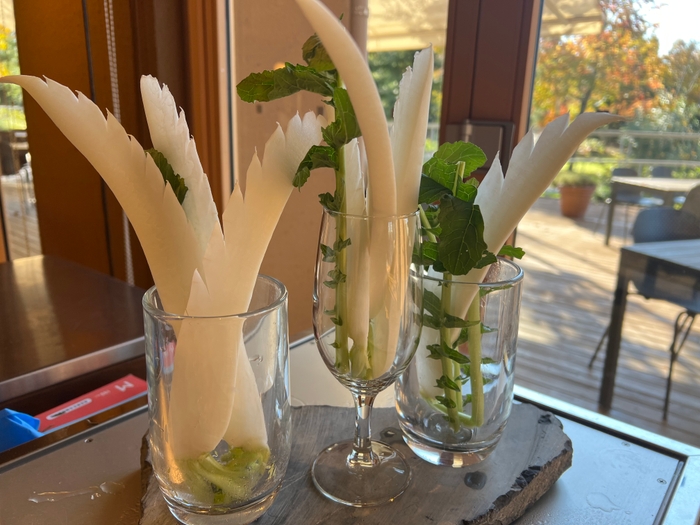 岸和田市にある「SMILE farm UCHINO」のダイコンは、自家製ぼかし肥料と竹チップ堆肥を使い、自然の力で育てられた一品。そのままスティック状で提供され、みずみずしさとさっぱりした甘みが際立っています。
