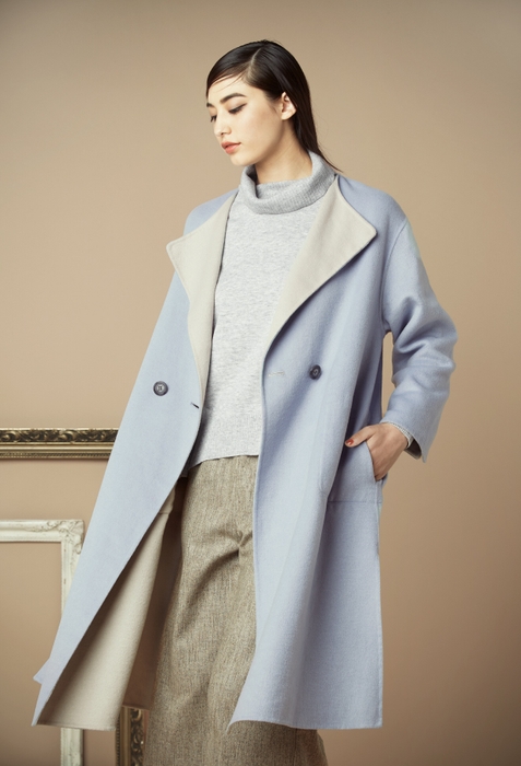 年々、コートも軽く着やすいものを求める方が増えています。軽くて暖かく、柔らかさを感じられる素材は何かと考え、ダブルフェイスの生地に出会いました。二重織りの一種で、柔らかな生地のダブルフェイスだから実現する、包み込まれるような着心地と暖かさです。着心地だけでなく、その日の気分やシーンに合わせて両面活躍できる、ファッション性を兼ね備えています。
