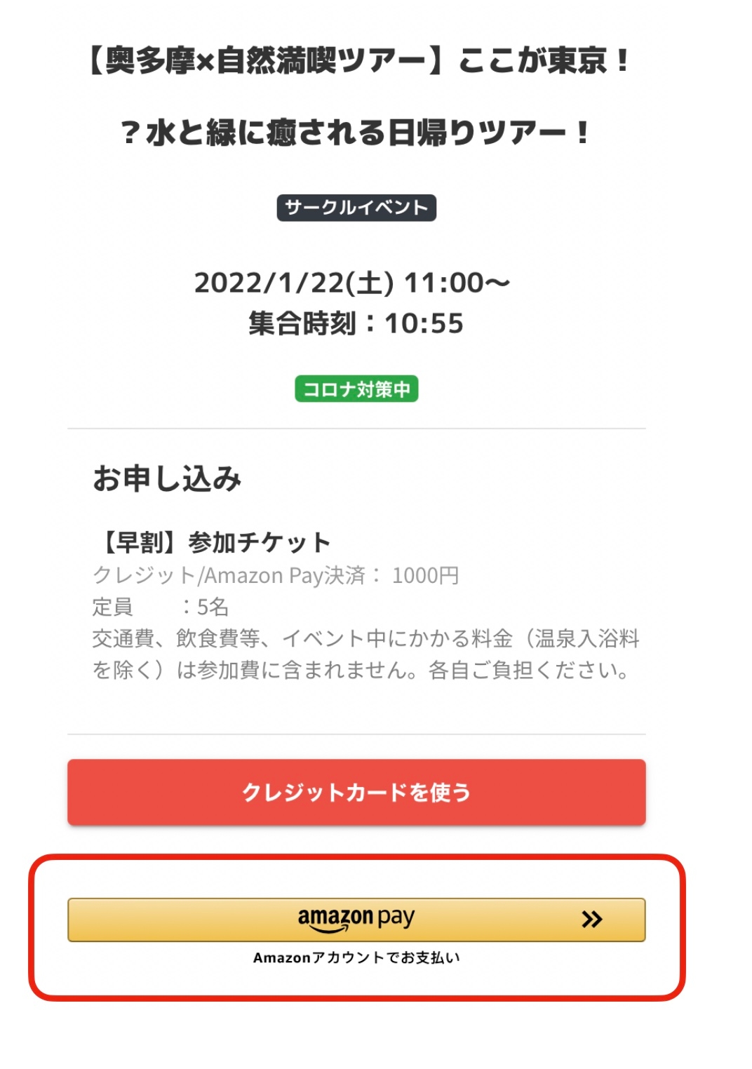 手順1 つなげーと上で、イベントの事前決済が求められている場合には「クレジットカード決済」および「Amazon Pay決済」のいずれかの決済方法から選んでいただけます。