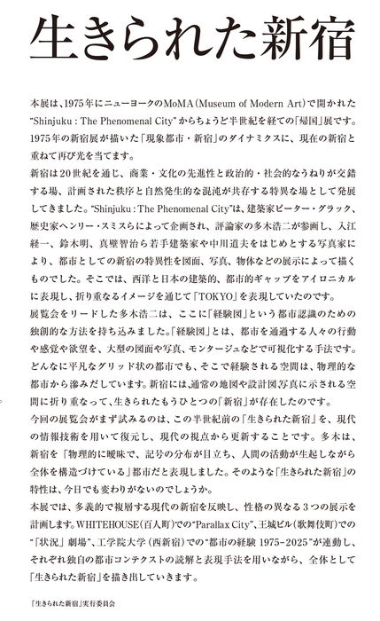 本展は、1975年にニューヨークのMoMA(Museum of Modern Art)で開かれた“Shinjuku : The Phenomenal City ” からちょうど半世紀を経ての「帰国」展として実施されます。会期中新宿エリアに3会場設置され、工学院大学新宿キャンパスが会場となる「都市の経験 1975-2025」では建築デザイン学科初田研究室、樫原研究室が展示運営に協力します。独自の都市コンテクストの読解と表現手法を用いながら、全体として「生きられた新宿」を描き出していきます。