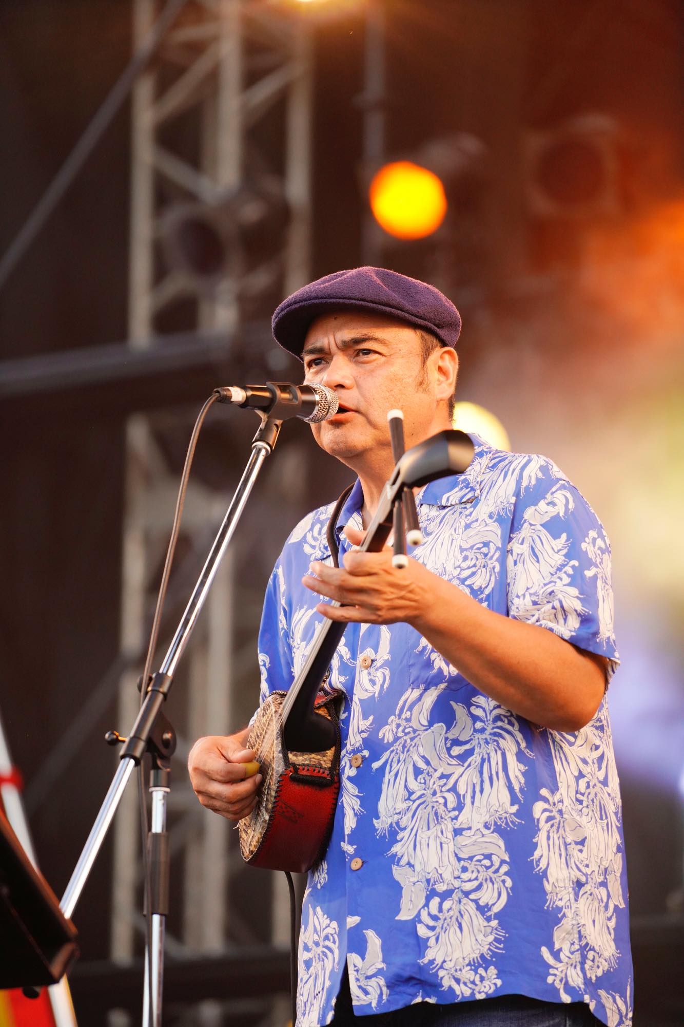 オープニングの一曲目は、うるま市との縁を伝えるために「ウルマメロディー」からはじまった。戦後、食糧不足となった沖縄に、沖縄の食文化を支える「豚」を届けてくれたのは、ハワイに住む沖縄出身の日系移民の方々だった。故郷に豚を送ろうと、ハワイのウチナーンチュたちが「恵みの歌」をつくり、ラジオで繰り返し放送し、募金を呼びかけた。結果、5万ドルという大金が集まり550頭の豚がポートランドから沖縄へと送られたという。そしてその時、船が着いた場所が、うるま市のホワイトビーチだった。そのことを知ったBEGINが、ハワイの方々への感謝を歌にしたのが、この日、オープニング曲となった「ウルマメロディー」だった。ステージには、フラのチームによる美しい踊りと、琉球國祭り太鼓のメンバーによる力強いエイサーが、歌に合わせて披露された。一曲目にして、「ここ」で行われる必然性がガチッとハマった、そんな印象を受けた、そんな「うたの日コンサート」の幕開けだった。