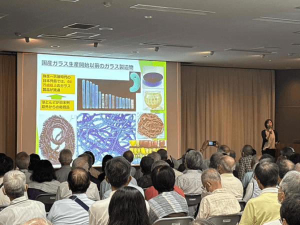 本中所長の挨拶の後、脇谷室長による「飛鳥池工房遺跡にも見られる遺跡の露出展示保存の課題と展望」、松田主任研究員による「木製遺物の保存処理-手のひらサイズから身の丈サイズまで」、柳田主任研究員による「古代の輝きはなぜくすむ?-飛鳥池遺跡と金属製文化財」、田村主任研究員による「飛鳥池遺跡におけるガラス生産-国産ガラスの誕生と題して」の講演がありました。