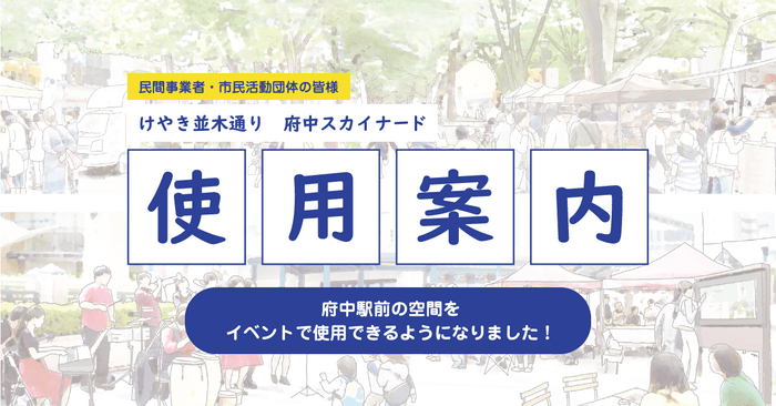 京王線府中駅前の賑わい創出を目的とし、けやき並木通りと府中スカイナード北口・南口(ペデストリアンデッキ)の指定のエリアを使用することが出来ます。