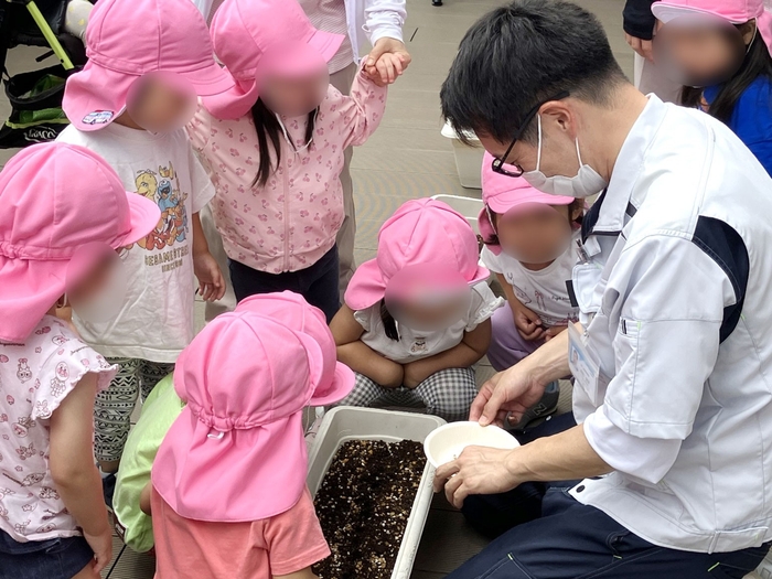 この夏も、i-Mall内「ヘルシーカフェ さくらテラス」に併設された〈さくらテラスガーデン〉で、併設保育園「さくら保育園」の園児たちによる収穫体験とひまわりの種まきが行われました。さくらテラスガーデンは同グループの植栽・養蜂管理課が日常管理を行っています。