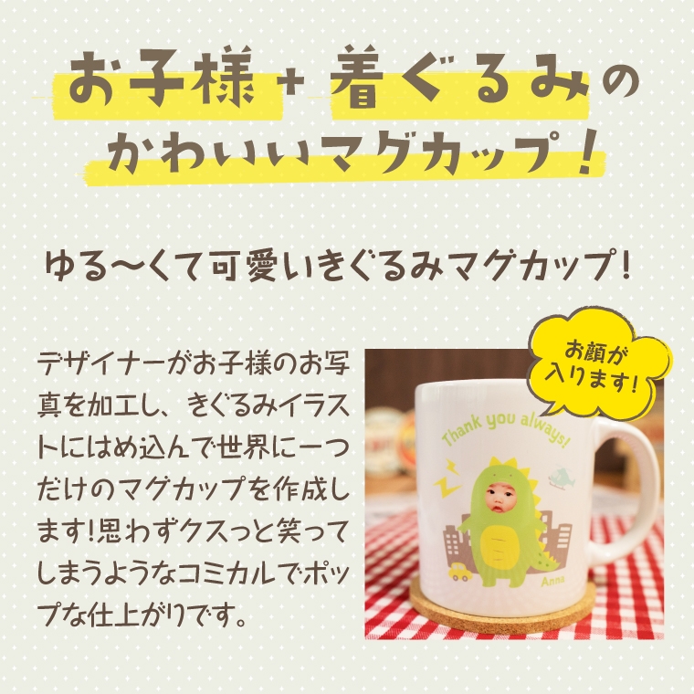 お子様の「顔写真」と「きぐるみ」を組み合わせた、世界に一つだけのオリジナルグッズ「きぐるみマグカップ」