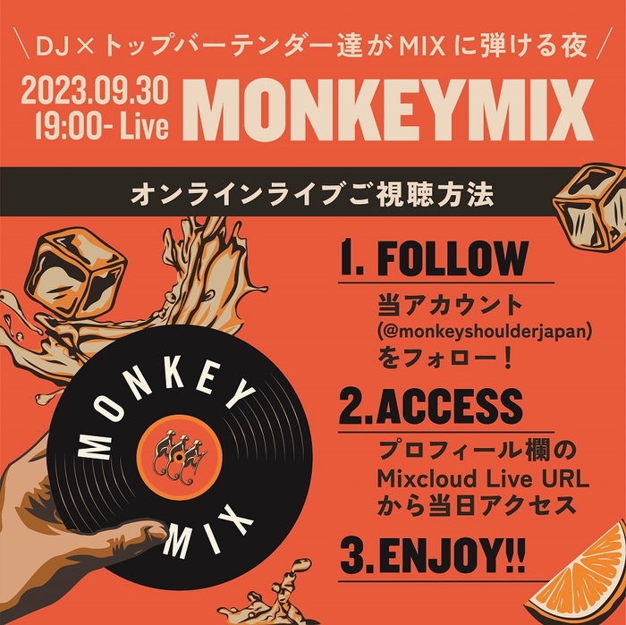 『100% MALT WHISKY MADE FOR MIXING』がコンセプトのモンキーショルダーは、9月30日(土)18時から、エースホテル京都 2 階にある PIOPIKO バー&タコスラウンジにて、DJ の音楽とトップバーテンダーのカクテルが響き合うライブイベント『MONKEY MIX』を開催します。