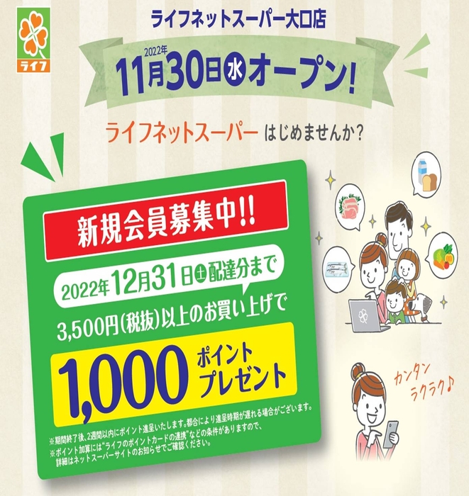 “おいしい” “ワクワク” “ハッピー” をお届けするライフコーポレーションは、11月30日(水)より「ライフ大口店」で「ライフネットスーパー」のサービスを開始いたしました。