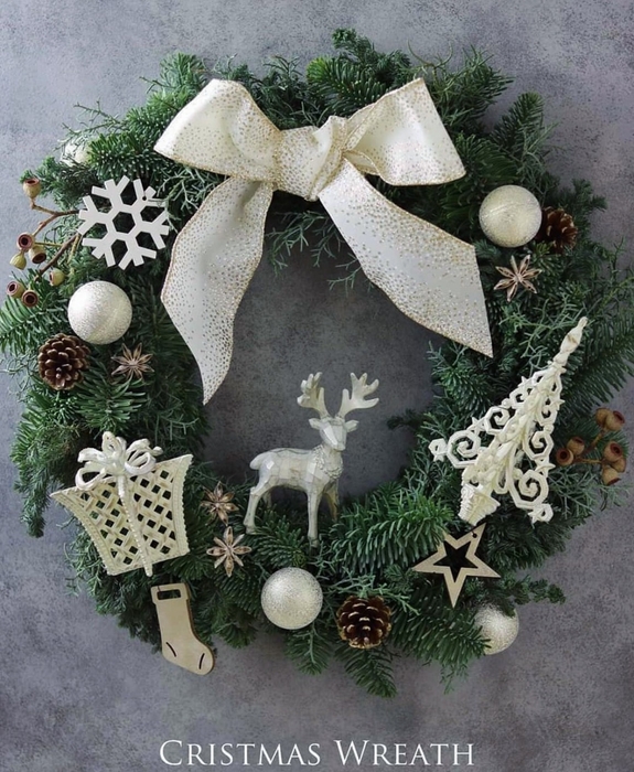 生花の針葉樹をたっぷり使って直径35〜40㎝のリースの土台を作り、お好きなオーナメントセットとリボンをお選びいただき、配置は自由にデザイン。(オーナメントセットはご希望が重なった場合には抽選とさせていただきます)仕上げに、規格外ローズから抽出した香りをふわりと纏わせて完成です!