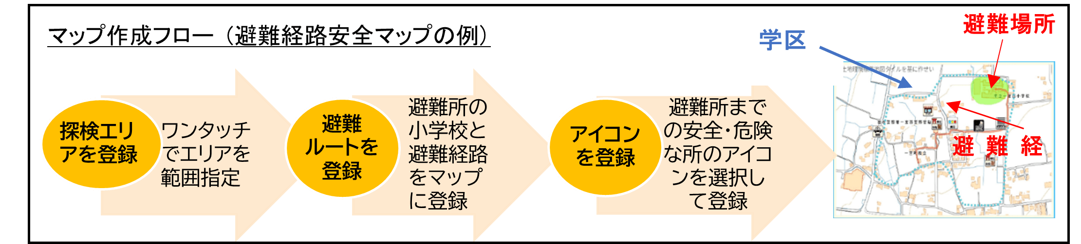 ・探検中、地図上の安全な地点や危険な地点ごとに写真をデータで取り込めるほか、コメントを音声や文字で入力できます。