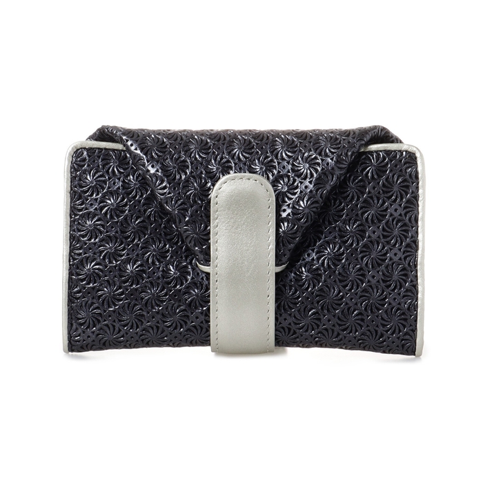 「GIRASOLE(ジラソーレ)」の一見金網のように見える連続的な模様の素材は、箔押しをした牛革に、型押しと型抜きを同時に施したブランドの人気商品です。今回の限定品「GIRASOLE BLUNERO」(ジラソーレ ブルネーロ)」ではブルーと交じり合い漆黒へと変化していくインクのようなブラックに、マットなシルバーを組み合わせました。いつでも新しい顔を見せてくれるベストセラー「ジラソーレ」の限定色を今年もお楽しみください。