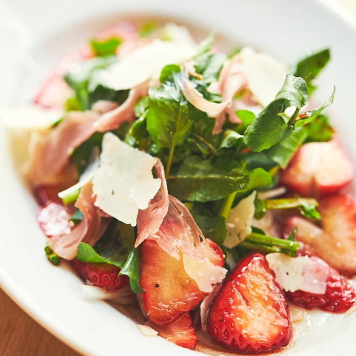 ●苺とクレソンのサラダ: クレソンの爽やかな辛味に、甘酸っぱい苺とパルメザン、生ハムを合わせた、風味豊かな春サラダです。フルーツとクレソンの絶妙な味わいをご堪能ください。