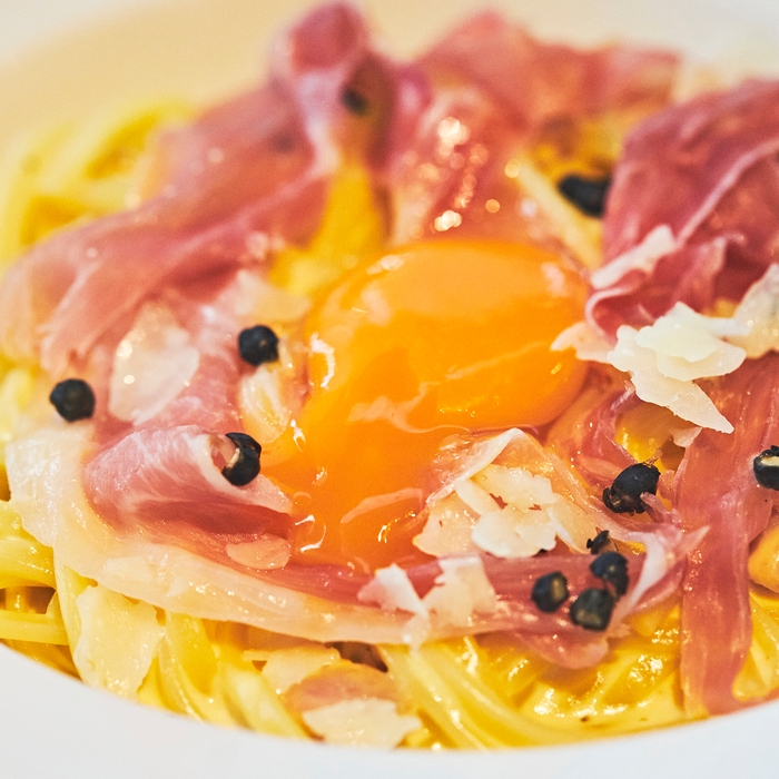 ●生カルボナーラ:4つの[生]を合わせたカルボナーラ。生パスタ・生タイプの粒コショウ・生たまご・生ハム。もちもちの生パスタに、クリーミーで濃厚なソースが絡まった病みつきになる味わいです。