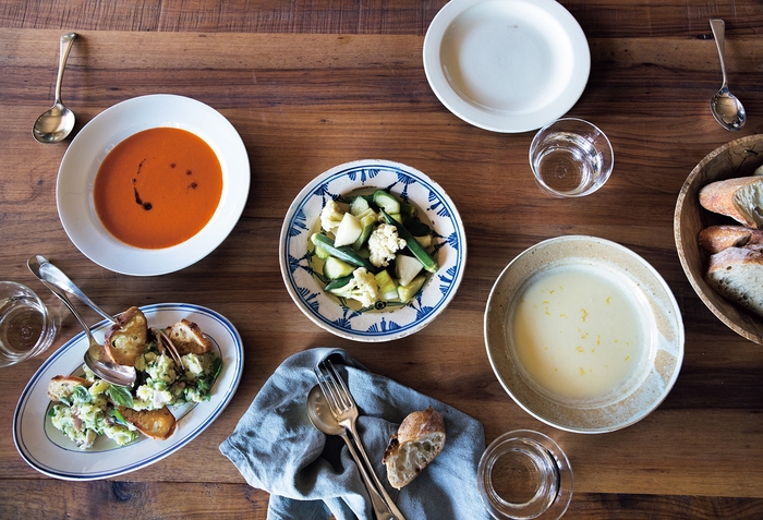 (新玉ねぎのだしポタージュ、春野菜のだしケークサレ、夏野菜のグリル だしジュレソース、アジアンだし冷麺 他)