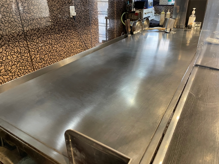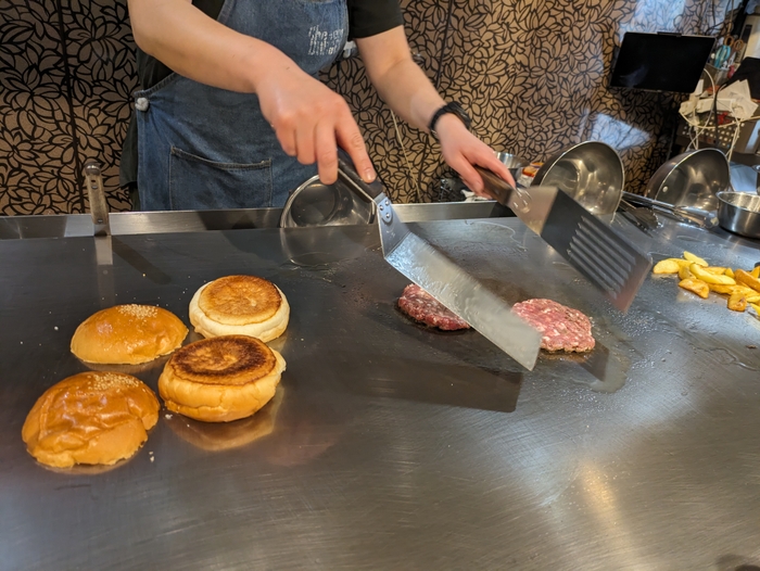 阿佐ヶ谷の店舗では、カウンター席から鉄板との距離が近く、そして鉄板の幅も広いため、まるでハンバーガーショーを見ているかのような感覚で、待っている間も楽しめるような演出がされています。
