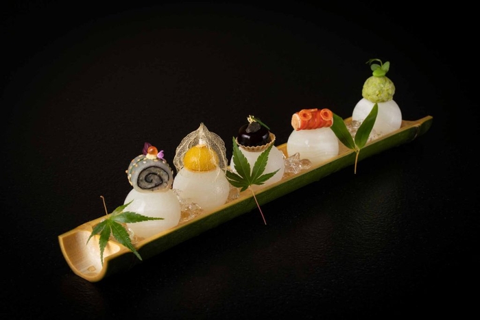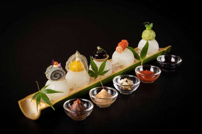 浜田の代表的な料理の一つです。五味(酸・塩・苦・辛・甘)をそれぞれ小さな料理に詰め込み、繊細な技術で表現しています。一つ一つの料理の味付けには、日本で古来より親しまれてきた味噌や塩麹、黒みりんといった発酵食品や、その他、塩漬けにしたサザエを麹で漬けた「サザエの麹漬け」や海苔と塩だけを使い発酵させた「海苔醤(のりびしお)」、唐辛子とゆずを使った「辛(から)麹(こうじ)」などの珍しい発酵食品も取り入れています。