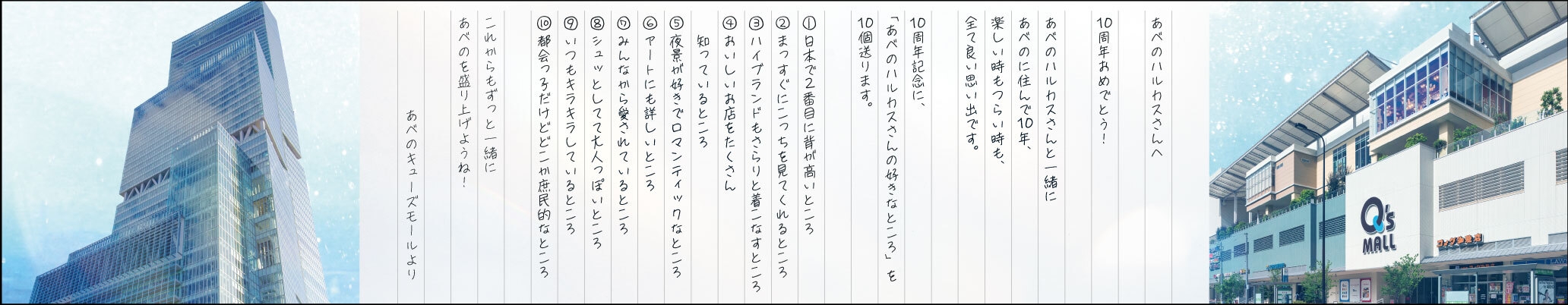 今回のあべのハルカス10周年を記念する交通広告では、あべのキューズモールからのお祝いメッセージを掲出します。地元を盛上げてきた商業施設として、10年間ともに歩んだ想いを綴りながら、「あべのハルカスさんの好きなところ」10個を送り、10周年をお祝いします。