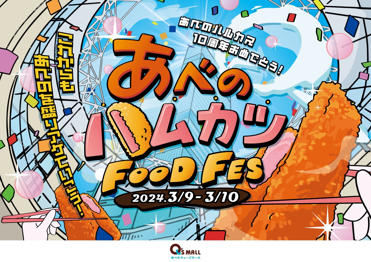 内 容:あべのハルカス10周年を記念して、「あべのハルカス」の語呂にちなみ「あべのハムカツ」と題したフードフェスを開催します。あべのハルカスを眺めながらハムカツをお楽しみいただけます。
