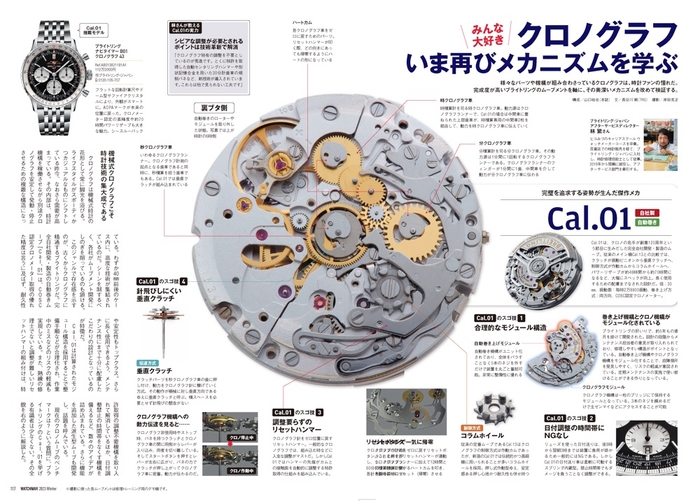 スタジオ ブライトリングの技術者に協力してもらい、ブライトリングの自社製とエボーシュベースの自動巻きクロノグラフキャリバー2種と、自社製手巻きクロノグラフキャリバー1種の機構を徹底解説しました。「次代を担う21世紀のブランド」では、リシャール ミルの誕生で幕を開けた新時代の時計業界について、2001年以降に創業したブランドのみを取り上げながら改めて考察しています。4名の時計カメラマンにより写真作品連載に、日本の著名な修理技術者と営業マンとの対話連載、専門学校の学生が1年がかりで制作する時計の完成までを追うドキュメンタリー連載など、今号も大充実の内容でお届けです。