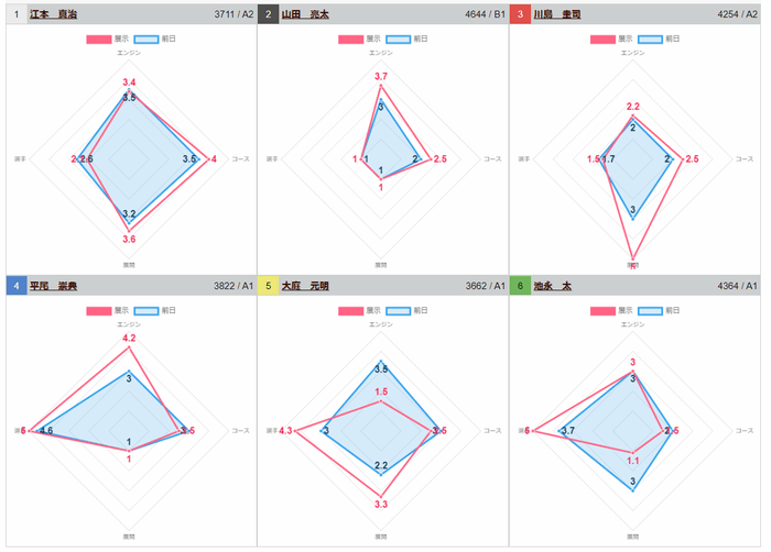 また各選手の情報を「エンジン」「選手」「展開」「コース」の4項目に分類、「直前の展示データ」と「前日データ」の変化や各レーサー同士の比較がひと目で分かる「報知スコープ」も評判です。