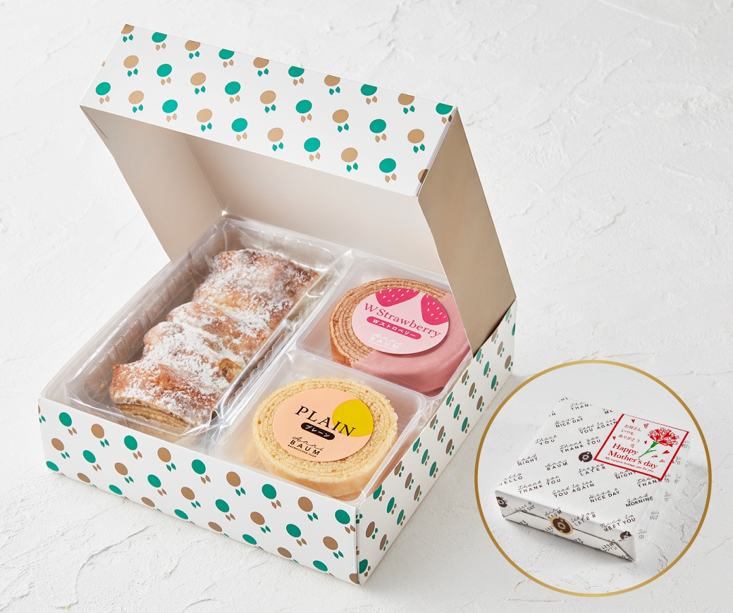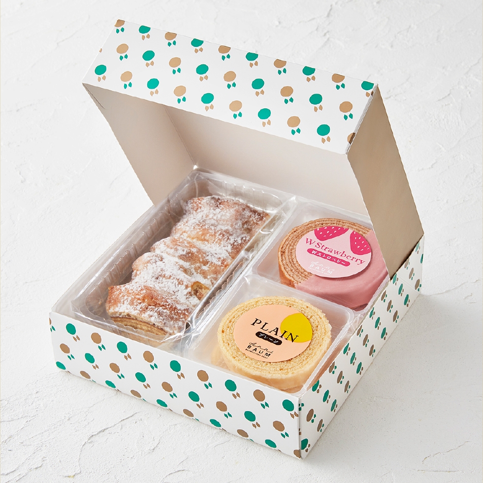風味の異なる2種の発酵バターを使用した濃厚でコクのある味わいの「リッチハード カット」、たっぷりのメレンゲでふわふわ食感に仕上げ、素材本来の美味しさを引き出した「アニバウム mini プレーン」、甘酸っぱいストロベリーピューレと苺果汁を入れ、ストロベリーチョコをコーティングした季節限定品「アニバウム mini Wストロベリー」を詰め込んだギフトセット。