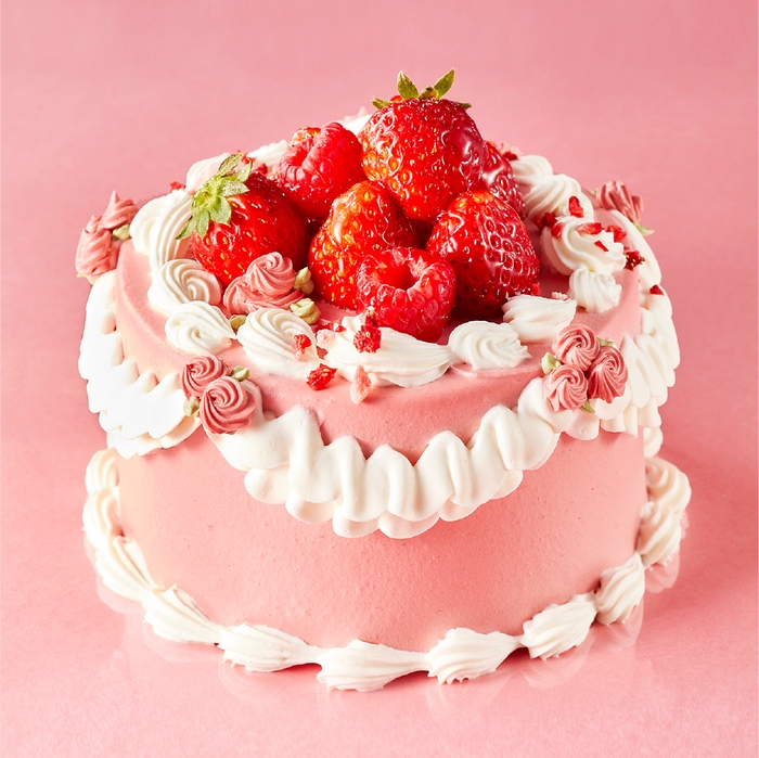 独自の黄金比率で二種類の生クリームをブレンドしたこだわりの生クリームと、苺チョコクリームで、華やかにデザインされたデコレーションケーキ。小さなバラを散りばめ、フリルをあしらった可愛らしいデザインで、母の日期間限定の特別なデコレーションに仕上げました。気温や湿度に合わせて調整し、職人たちの経験によって最高の焼き加減で仕上げるスポンジ生地とたっぷりの苺をサンドし、苺とラズベリーをトッピングしました。