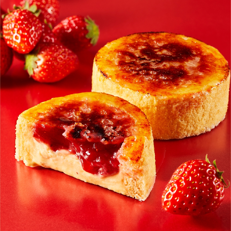 3月から登場した「苺の濃厚ブリュレバウム」は、定番人気の「濃厚ブリュレバウム」の季節限定品です。ふわっと焼き上げたこだわりのバウムクーヘンに特製カスタードと苺のコンフィチュールをトッピングし、パリッとブリュレしました。甘酸っぱい苺とカスタードのコク、ふんわりとした優しい味わいのバウムクーヘンの絶妙なハーモニーをお楽しみください。