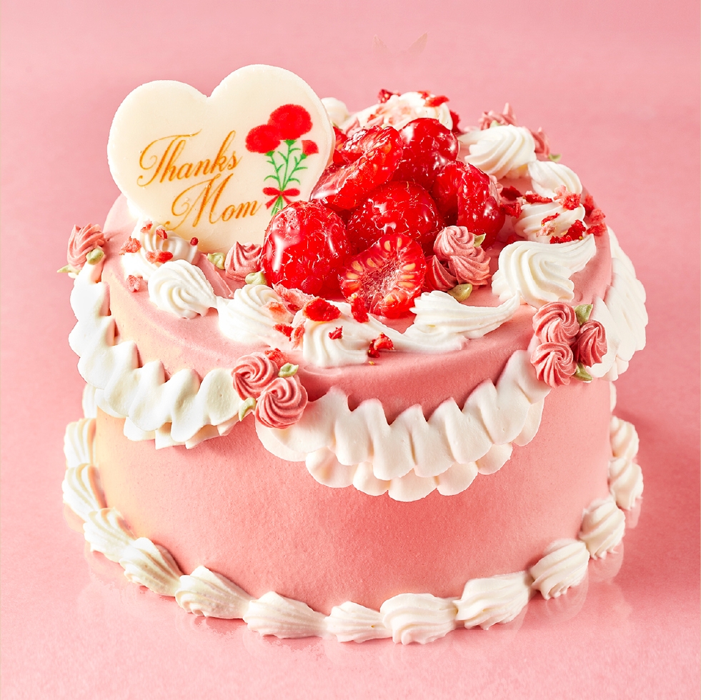 店頭販売用の華やかなデコレーションはそのままに、ラズベリー、母の日プレートをトッピングした母の日限定のデコレーションケーキです。