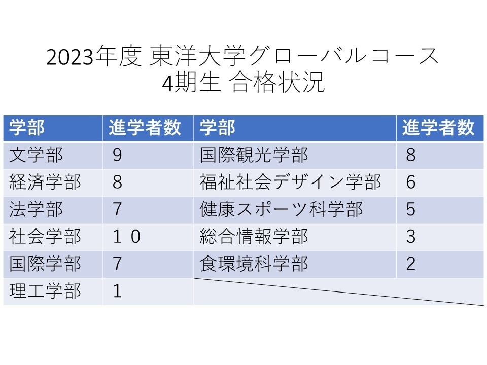 この度、「東洋大学グローバルコース」の4期生について、66名が東洋大学に合格しました。このコースに所属する生徒の62%に当たります。