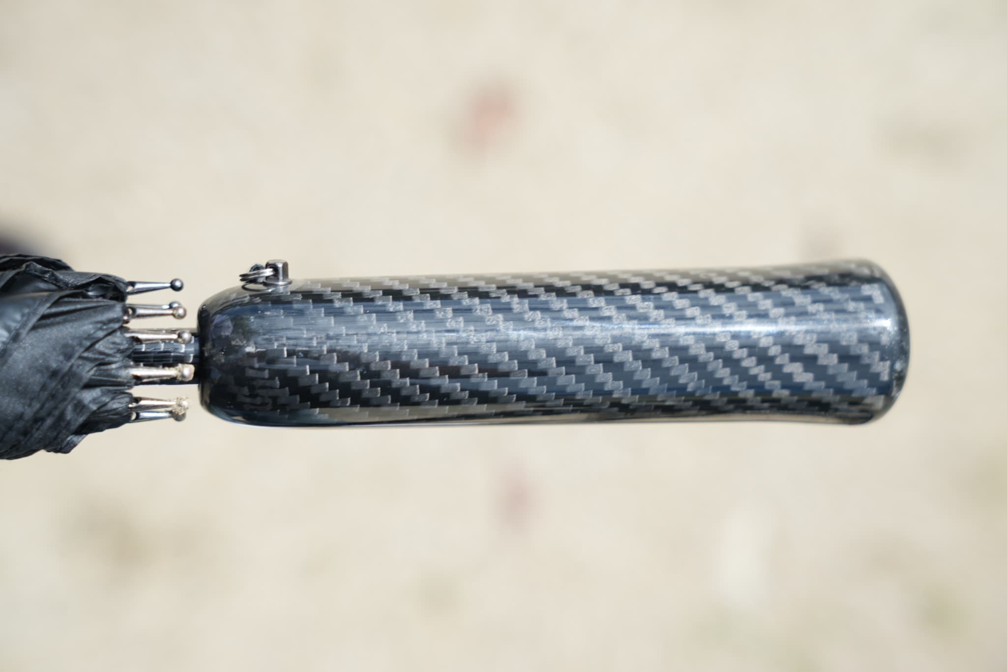 「Carbrella light」は主要なパーツすべてにカーボンファイバーを使用しています。カーボンファイバーは航空機やロケットに使用される最先端素材であり、強度は鉄の10倍、重さは鉄の1/4、しかも錆びないという傘に求められる特徴があり独特の光沢が非常に美しいためデザイン性にも優れた製品を制作できると考えました。