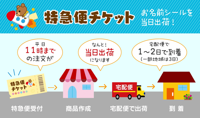 オーダーメイドですが、お名前シールはご注文翌日より1〜2営業日で出荷。