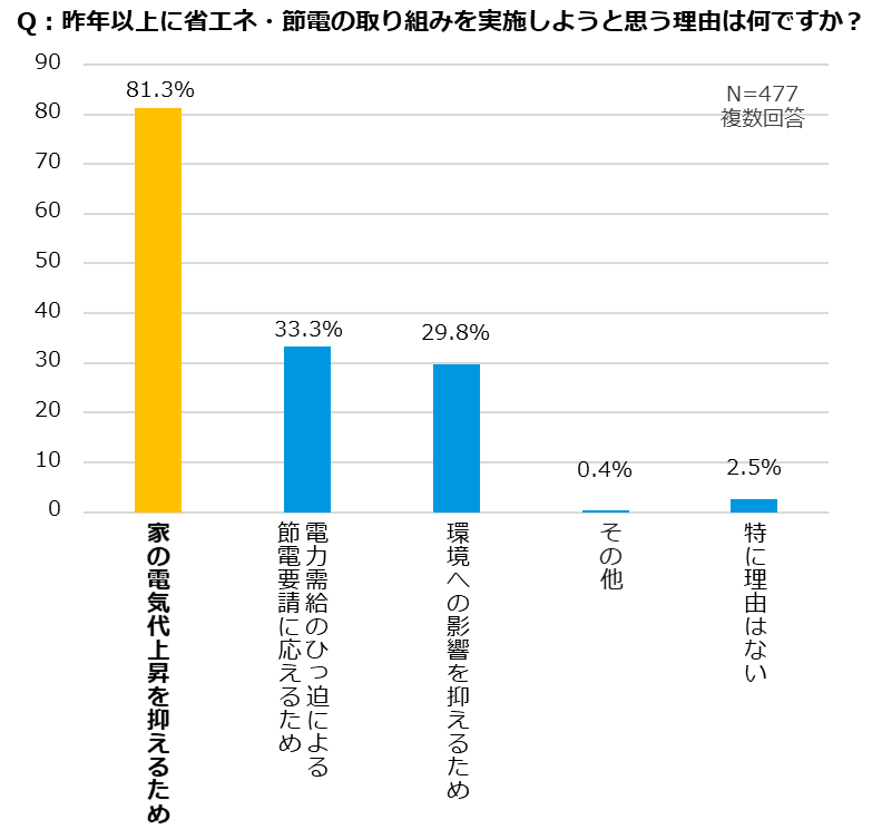 省エネ・節電に積極的に取り組む理由を聞いたところ、約8割(81.3%)の人が「家の電気代上昇を抑えるため」と回答し、他の項目を大きく抑えて最も多い結果となりました。節電要請に応えたい気持ちや、近年高まりつつある環境への意識がありつつも、現状では日常の生活と密接にかかわる「電気代の上昇」を強く意識している人が多いようです。