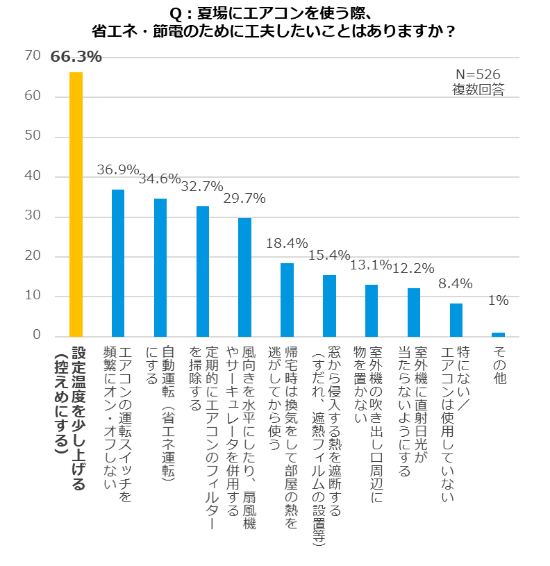 一方で「定期的にエアコンのフィルターを掃除する(32.7%)」、「室外機の吹き出し口周辺に物を置かない(13.1%)」など、その他の工夫ポイントについては1~3割程度の実施にとどまっており、まだまだ工夫の余地は大きいと言えそうです。これからこうした節電術が多くの人に取り入れられることで、無理のない省エネ・節電習慣になっていくことが期待されます。