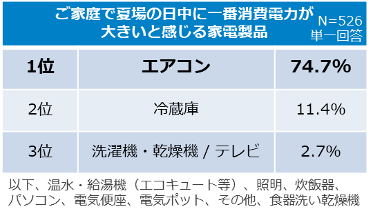 消費電力が大きいと感じる家電1位は「エアコン(74.7%)」 夏場の消費電力の約6割をエアコンが占めているが、 約8割の人はエアコンの消費電力を少なく見積もっている