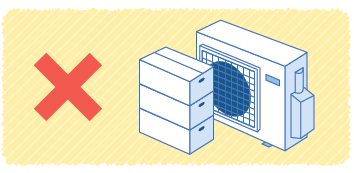 室外機の吸込口や吹出口がふさがれると、エアコンに負荷がかかってしまいます。エアコンの運転効率が下がることで、消費電力が上がり、電気代も上がります。室外機にカバーをかけたり、室外機の周辺に荷物を置いたりせず、室外機周辺の風の流れを妨げないようにしましょう。
