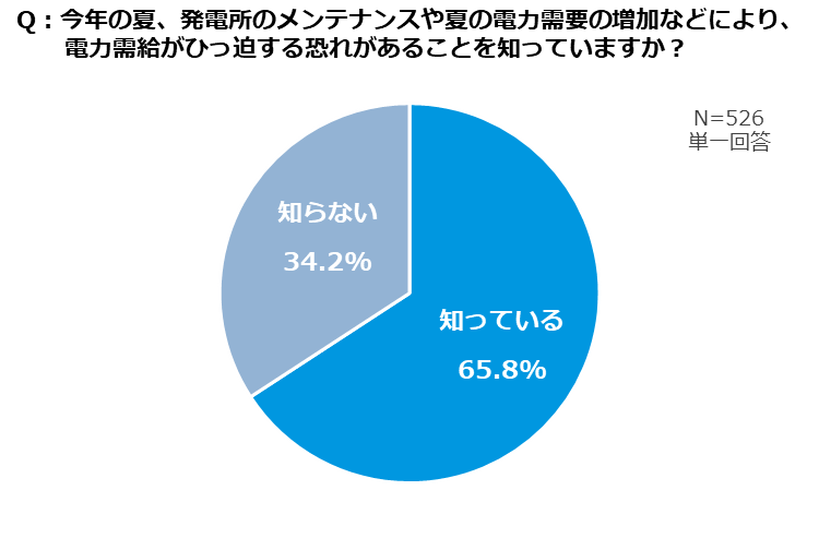 「今年の夏、電力需給がひっ迫する恐れがあることを知っていますか?」との質問に、約7割(65.8%)の人が「知っている」と回答しました。また、「電気代上昇によって家計への負担の高まりを感じていますか?」との質問には、約8割(78.9%)の人が「感じている」と回答し、多くの人がこの夏の電力需給や電気代を意識していることが明らかになりました。