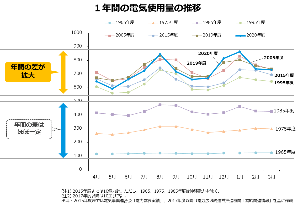 資源エネルギー庁の調査によると、夏の日中(14時ごろ)の一般家庭における電力消費は、照明や冷蔵庫を抑え、エアコンが最大(58%)で約6割を占めていると言われています。さらに、以前は、電気使用量は年間を通じてほぼ一定だったのが、近年、季節によってその差が拡大しています。夏と冬に電気使用量のピークを迎えていることから、季節によって使用頻度が大きく変わるエアコンも、夏場の電力需給に与える影響は大きいと考えられます。