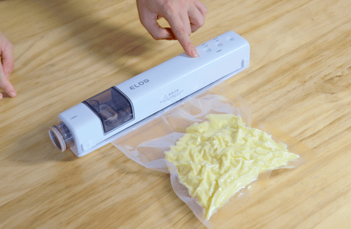 片面にエンボス加工のある袋に食品を入れて、本体に設置し、ボタンを押すだけで「吸引からシーリング」する事で真空パックにすることができます。