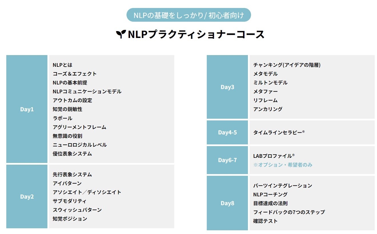 ※「NLPマスタープラクティショナーコース」に関しましては、今後募集開始予定となっております。