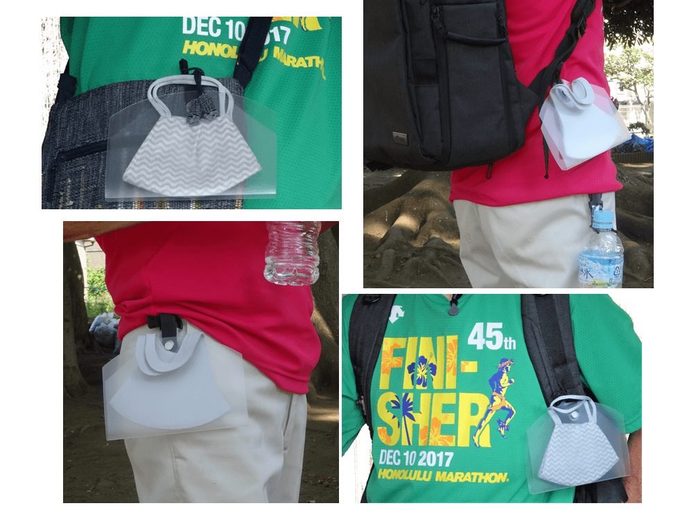 ホルダーは、世界で初めての胸や腰やベルトなど使いやすい場所につけられるマスク用のホルダーです。どこかから出す必要も、広げたりするする必要も、仕舞う必要もありません。