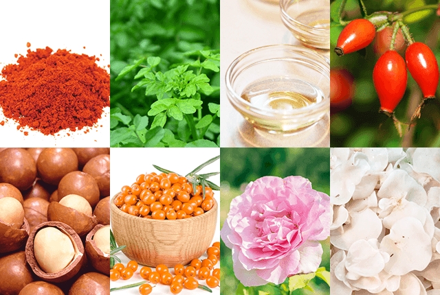 馬油、アルガニアスピノサ核油、スクワラン、アスタキサンチン、カニナバラ果実油、フランスカイガンショウ樹皮エキス、マカデミア種子油、オリーブ果実油、乳酸桿菌、ヒポファエラムノイデス果実エキス、テリハボク種子油、ヘチマ葉エキス、テルミナリアフェルジナンジアナ果実エキス、オランダガラシエキス、シロキクラゲ子実体エキス、ビワ葉エキス、セイヨウヤブイチゴ果実エキス、ゲットウ葉エキス、センチフォリアバラ花油、ニオイテンジクアオイ油、ニュウコウジュ油、イランイラン花油、ハッカ葉油、ヘマトコッカスプルビアリスエキス、マルトデキストリン、ローズマリー葉エキス、トコフェロール