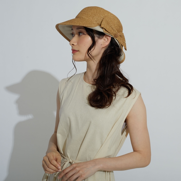 前を長くかぶるとお顔の紫外線対策に、後ろはすっきりしたシルエットに。